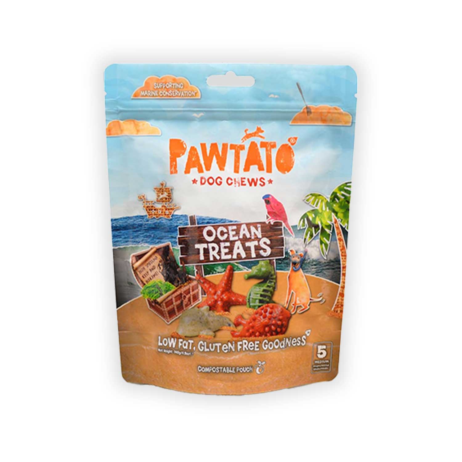 Sea creature shaped, sweet potato based vegan chews for dogs from Pawtato! These delicious chews are made with sustainably farmed kelp, wakame and spirulina for a taste of the sea!